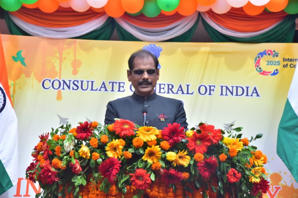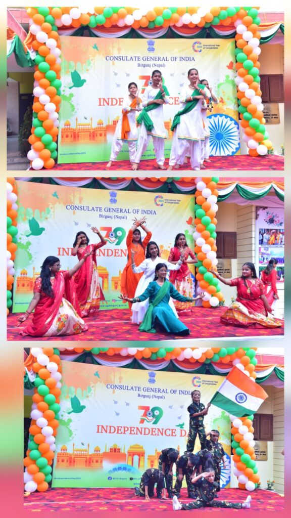 भारतको ७९ औं स्वतन्त्रता दिवसको अवसरमा वीरगञ्जस्थित भारतीय महावाणिज्य दूतावासले आज विशेष उत्सवको आयोजना गर्यो। बिहानैदेखि सुरु भएको समारोहमा राष्ट्रिय झण्डा फहराउने, राष्ट्रिय गान बजाउने र भारतका राष्ट्रपति द्रौपदी मुर्मुबाट पठाइएको विशेष सन्देश वाचनजस्ता औपचारिक गतिविधिहरू सम्पन्न भए। महावाणिज्यदूत डिएस मिनाले राष्ट्रपति सन्देश पढ्दै यस ऐतिहासिक अवसरमा उपस्थित सबै अतिथि र सहभागीहरूप्रति आभार व्यक्त गरे।