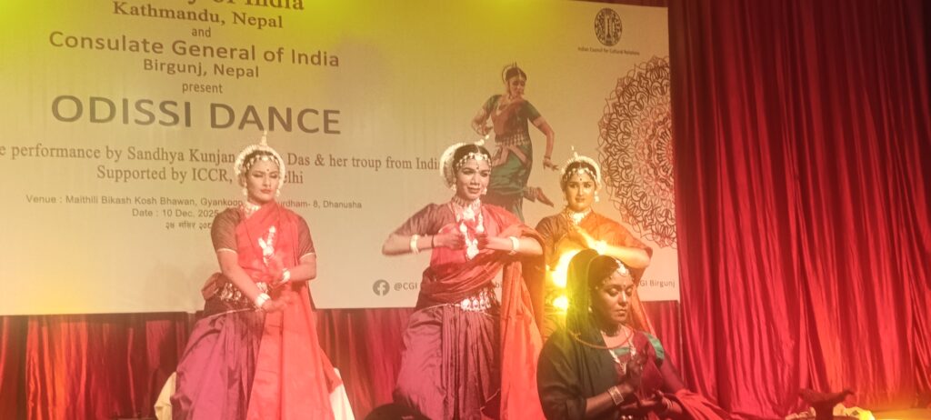 भारतको महावाणिज्य दूतावासद्वारा आयोजित ओडिसी नृत्य प्रस्तुतिले बुधवार जनकपुरधामका दर्शकलाई मन्त्रमुग्ध बनायो। सन्ध्या कुञ्जन मेनन दास नेतृत्वको पाँच सदस्यीय टोलीले प्रस्तुत गरेको यो शास्त्रीय नृत्य मनोहारिणी ताल, कोमल गतिशीलता र अभिव्यक्तिमूलक अभिनयले भरिएको थियो।