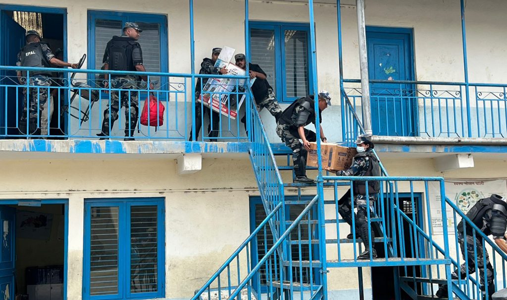 विद्यालयका फर्निचर, पुस्तक, कापी तथा स्टेशनरी सामग्री Nepal Police र Armed Police Force Nepal को टोलीले सुरक्षित रूपमा स्थानान्तरण गरिरहेको छ।